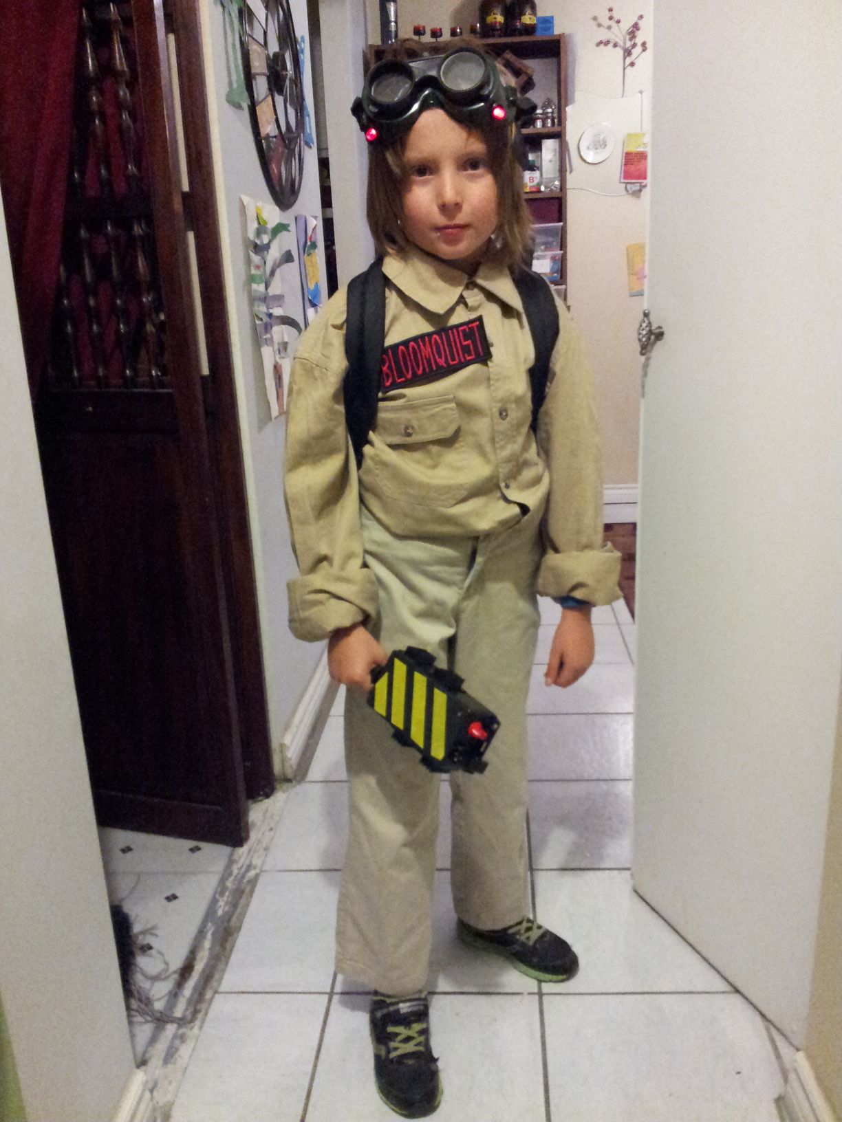 The costume was also very simple. In lieu of a “jumpsuit” we found some tan slacks and a shirt at Walmart. The nametag is proof that you can find virtually anything on the Internet (at least eBay) – there’s a seller who makes and sells custom Ghostbusters nametags with the original font! I ordered one for myself too! Similarly, the “No Ghost” logo patches are readily found on eBay and elsewhere.